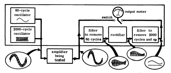 The method of testing for this kind of distortion is to use two oscillators that generate audio frequencies differing by a fixed amount. For example, if we decide to use the 200-cycle difference frequncy, we would arrange that one oscillator give 4000 cycles and the other one 4200 cycles. Or, to test at a higher frequency, when one oscillator gives 8000 cycles the other must give 8200 cycles. The output from the amplifier is passed through a filter that rejects the high frequencies and picks out any component at 200 cycles. The problem with this method of measurement is that it only discovers whether there is any distortion due to the curvature that would cause second harmonic distortion. Other kinds of curvature will also produce distortion, but will not result in a simple 200-cycle difference tone. Rather, they will cause all sorts of other unwanted tones. For this reason and others too complicated to give a complete explanation, the results of the two methods of intermodulation test and harmonic measurement are not consistent, but they depend on the amount of different kinds of curvature in the amplification characteristic of the amplifier.