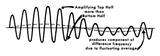 Suppose that a 60-cycle wave has 5% of second harmonic. This will mean one-half of the wave will get amplified by 5% more, while the other is amplified by 5% less. If the amplifier is also called upon to handle a 2000-cycle wave of much smaller magnitude than the 60-cycle wave, this will also get amplified by 5% more on one peak of the 60-cycle wave than it does on the other peak of the 60-cycle wave. Thus the 2000-cycle wave will be fluctuating in amplitude at the rate of 60 cycles.