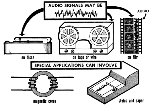 Recording plays an important part, not only in audio for high-fidelity purposes, but also in the many other applications for which modern audio equipment is used. It can be regarded as a storage medium in which long sequences of audio waveforms can be indefinitely preserved for reproducing at a later date. In the case of high fidelity, this audio waveform sequence may be a complete musical performance. For computer and other industrial applications, the sequence may be any audio waveform combination representing information. It may be a record of the vibrations that occur in different parts of a supersonic missile in flight or a record of the progress of a certain industrial process that requires careful comparison of the results of the process in successive hour periods. By recording the data during a complete hour and then comparing the result with the corresponding data exactly one hour later, the process could be continually controlled. A variety of media are used for storing audio material: disc, tape, wire, and film.
