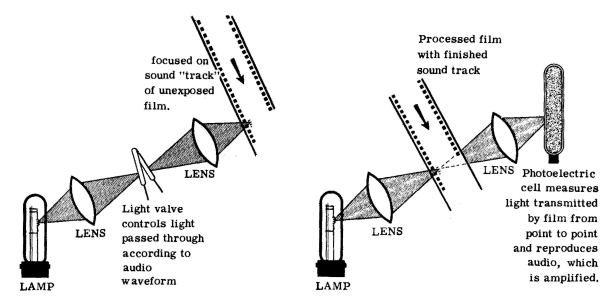Film recording is usually achieved photographically by producing an exposure on the film proportional to the instantaneous audio. This is accomplished by means of a light "valve" that controls the amount of light falling on the film as it passes by a slot. In playback, the same film, with the recording photographically reproduced on it, is scanned by means of a photoelectric cell, the output from which is amplified by an audio amplifier. Because the photoelectric cell is sensitive to the quantity of light, the sound track on the film can vary either in the area through which light passes or in the transparency (density) of the film. Both methods have their uses, their advantages and disadvantages, which are concerned more with light and optics than with audio. As with the other methods of recording, special equalization is required on playback.