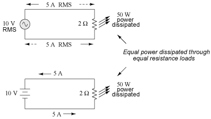 The problem of trying to describe the changing quantities of AC voltage or current in a single, aggregate measurement is also present in this saw analogy: how might we express the speed of a jigsaw blade? A bandsaw blade moves with a constant speed, similar to the way DC voltage pushes or DC current moves with a constant magnitude. A jigsaw blade, on the other hand, moves back and forth, its blade speed constantly changing. What is more, the back-and-forth motion of any two jigsaws may not be of the same type, depending on the mechanical design of the saws. One jigsaw might move its blade with a sine-wave motion, while another with a triangle-wave motion. To rate a jigsaw based on its peak blade speed would be quite misleading when comparing one jigsaw to another (or a jigsaw with a bandsaw!). Despite the fact that these different saws move their blades in different manners, they are equal in one respect: they all cut wood, and a quantitative comparison of this common function can serve as a common basis for which to rate blade speed. Picture a jigsaw and bandsaw side-by-side, equipped with identical blades (same tooth pitch, angle, etc.), equally capable of cutting the same thickness of the same type of wood at the same rate. We might say that the two saws were equivalent or equal in their cutting capacity. Might this comparison be used to assign a "bandsaw equivalent" blade speed to the jigsaw's back-and-forth blade motion; to relate the wood-cutting effectiveness of one to the other? This is the general idea used to assign a "DC equivalent" measurement to any AC voltage or current: whatever magnitude of DC voltage or current would produce the same amount of heat energy dissipation through an equal resistance: