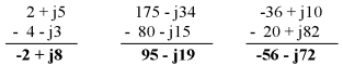 When subtracting complex numbers in rectangular form, simply subtract the real component of the second complex number from the real component of the first to arrive at the real component of the difference, and subtract the imaginary component of the second complex number from the imaginary component of the first to arrive the imaginary component of the difference: