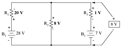 The polarity of all voltages in Millman's Theorem are referenced to the same point. In the example circuit above, I used the bottom wire of the parallel circuit as my reference point, and so the voltages within each branch (28 for the R1 branch, 0 for the R2 branch, and 7 for the R3 branch) were inserted into the equation as positive numbers. Likewise, when the answer came out to 8 volts (positive), this meant that the top wire of the circuit was positive with respect to the bottom wire (the original point of reference). If both batteries had been connected backwards (negative ends up and positive ends down), the voltage for branch 1 would have been entered into the equation as a -28 volts, the voltage for branch 3 as -7 volts, and the resulting answer of -8 volts would have told us that the top wire was negative with respect to the bottom wire (our initial point of reference). To solve for resistor voltage drops, the Millman voltage (across the parallel network) must be compared against the voltage source within each branch, using the principle of voltages adding in series to determine the magnitude and polarity of voltage across each resistor:
