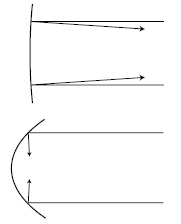 The sum θi+θo is a constant. What does this constant represent? Geometrically, we interpret it as double the angle made by the dashed radius line. Optically, it is a measure of the strength of the mirror, i.e., how strongly the mirror focuses light, and so we call it the focal angle, θf, θi+θo = θf Suppose, for example, that we wish to use a quick and dirty optical test to determine how strong a particular mirror is. We can lay it on the floor as shown in figure (e), and use it to make an image of a lamp mounted on the ceiling overhead, which we assume is very far away compared to the radius of curvature of the mirror, so that the mirror intercepts only a very narrow cone of rays from the lamp. This cone is so narrow that its rays are nearly parallel, and θo is nearly zero. The real image can be observed on a piece of paper. By moving the paper nearer and farther, we can bring the image into focus, at which point we know the paper is located at the image point. Since θo≈0, we have θi≈θf, and we can then determine this mirror's focal angle either by measuring θi directly with a protractor, or indirectly via trigonometry. A strong mirror will bring the rays to a focal point close to the mirror, and these rays will form a blunt-angled cone with a large θi and θf.