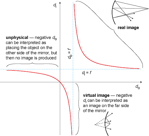 MagnificationWe have already discussed in the previous chapter how to find the magnification of a virtual image made by a curved mirror. The result is the same for a real image, and we omit the proof, which is very similar. In our new notation, the result is M=di/do. An numerical example is given in the following section.
