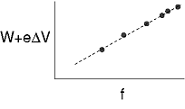 Numerical relationship between energy and frequencyPrompted by Einstein's photon paper, Robert Millikan (whom we encountered in book 4 of this series) figured out how to use the photoelectric effect to probe precisely the link between frequency and photon energy. Rather than going into the historical details of Millikan's actual experiments (a lengthy experimental program that occupied a large part of his professional career) we will describe a simple version, shown in figure f, that is used sometimes in college laboratory courses. The idea is simply to illuminate one plate of the vacuum tube with light of a single wavelength and monitor the voltage difference between the two plates as they charge up. Since the resistance of a voltmeter is very high (much higher than the resistance of an ammeter), we can assume to a good approximation that electrons reaching the top plate are stuck there permanently, so the voltage will keep on increasing for as long as electrons are making it across the vacuum tube.