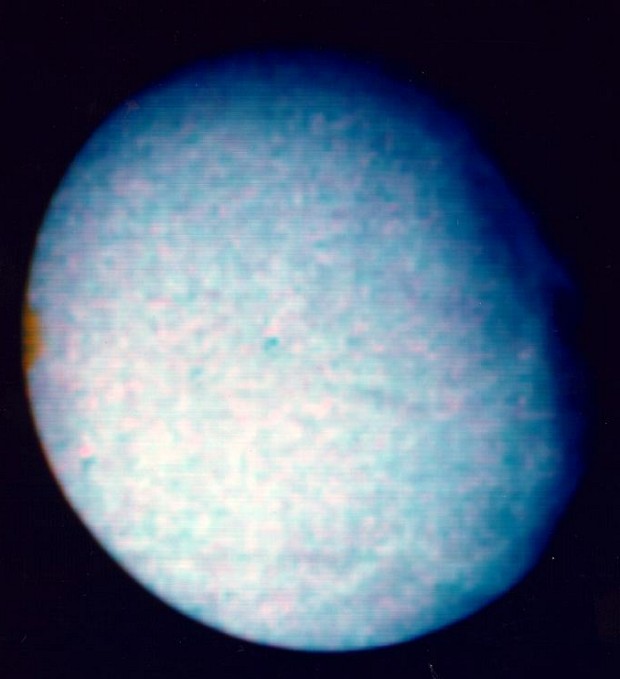Little detail is visible on the surface of Saturn's satellite Enceladus in this color-enhanced image taken by NASA's Voyager 1 on Nov. 12, 1980 from a distance of 655,000 kilometers (393,000 miles). The lack of visible surface detail on the satellite indicates that Enceladus' surface is dramatically different from the surfaces of the other larger Saturnian moons. Voyager 2 will fly much closer to Enceladus (within 90,000 kilometers or 54,000 miles) when the spacecraft arrives at Saturn in August 1981, to obtain higher resolution images of the moon. The Voyager Project is managed for NASA by the Jet Propulsion Laboratory, Pasadena, California.