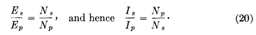 Closely Coupled CircuitsWhen the primary and secondary of an inductively coupled circuit are on a closed ferromagnetic core a closely coupled transformer, or transformer, exists. In communication, transformers are often regarded as impedance changers, a viewpoint that will now be discussed. Assume that a transformer, or repeating coil, as it is often called in telephony, has a closed core of Permalloy and that all the magnetic flux φ produced by the primary winding Np links with the secondary turns Ns; also, assume that the losses in the transformer are negligible. The magnitude of the back voltage induced in the primary is given by the fundamental expression ep = Npdφ/(108 dt), and this will approximately equal the impressed voltage. The magnitude of the voltage induced in the secondary will be es = Nsdφ/(108 dt). Dividing the second equation by the first, and in terms of effective instead of instantaneous values, gives