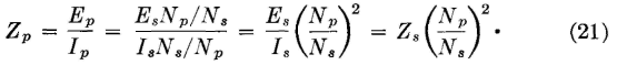 To determine the approximate impedance transforming equations, suppose that the transformer secondary is delivering power to a load. The magnitude of the load impedance will be ZL = Es/Is and the impedance measured across the primary terminals will be Zp = Ep/Ip. From equation 20, Ep = EsNp/Ns, and Ip = IsNs/Np, and, when these are substituted in the equation for the primary impedance,