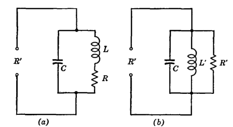 Increasing an Impedance. Impedance transforming circuits are used extensively in radio. Usually the load to be matched contains both resistance and reactance. This reactance is often neutralized (and the phase angle of the load changed) by connecting an equal and opposite reactance in series. If this is done, then there remains only resistance to be transformed into a new value. A method of increasing a resistance will now be considered. The circuit of Fig. 14 (a) can be used to increase a resistance to a larger value. The resistance R may be a resistor or a circuit actually inserted in series with the inductor L, or it may be resistance reflected in series with the coil in accordance with coupled-circuit theory. Assume that R must appear as a larger value R' at the points indicated. The principle involved is to transform R to the desired value R' by connecting R in series with some inductor L. The equivalent inductance L' then is neutralized with capacitor C, leaving only the transformed value of R' effective between the terminals. As an illustration, suppose that it is desired to transform 100 ohms resistance to 500 ohms resistance at 5.0 megacycles. Using equation 31