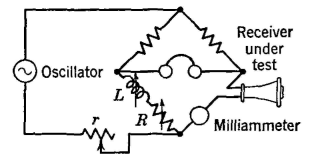Input Impedance of Telephone ReceiversA receiver or a loudspeaker is an electric motor, and information regarding operation can be obtained from input impedance measurements. The data and the discussion in the following pages are for a small low-impedance head receiver. This receiver was resonant at about 840 cycles. Similar tests can be made on other telephone receivers and can also be made on loudspeakers. The results would be somewhat different because some modern receivers and loudspeakers are less resonant. If a receiver is connected to an impedance bridge as in Fig. 25, if the test current indicated by the milliammeter is held constant by rheostat r, and if the resistance R and the inductance L required to balance the receiver impedance at different frequencies are measured, it will be found that these measured values vary greatly with test conditions. If the receiver is radiating sound energy into a small closed box the impedance will be greatly different from that if it is radiating into a large room. Or if the receiver is held to the ear the impedance will be different from that measured if it is radiating into a room. The impedance of a receiver or loudspeaker varies with the acoustic load on the diaphragm.