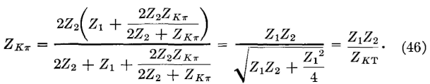 For the π section, the iterative impedance ZKπ is the input impedance at terminals 1-2 of Fig. 19(b) when terminals 3-4 are terminated in the iterative impedance ZKπ of the π network. Thus