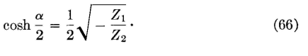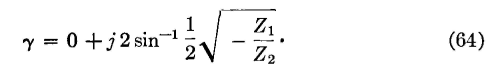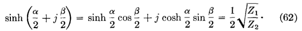 Since it was previously shown that 0.5*sqrt(Z1/Z2) and γ are pure imaginaries for the case being considered, then the real part of equation 62, that is, sinh α/2 cosβ/2, must be zero. For this to be true, either sinh α/2 or cosβ/2 must equal zero. If sinh α/2 = 0, then cosh α/2 = 1, because of the numerical relations between these two hyperbolic functions. When these relations exist, equation 62 becomes