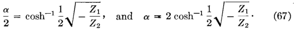 If Z1/Z2 is greater than -4, then 0.5*(sqrt(-Z1/Z2)) would exceed 1, and equation 63 cannot hold because the sine of an angle cannot exceed unity. Thus, from equation 64 a filter will transmit without attenuation when Z1/Z2 is negative and less than -4 in magnitude. Case III. When Z1/Z2 is more negative than -4. For values of Z1/Z2 more negative than -4, the real part sinh α/2 cosβ/2 of equation 62 can be made zero by cos β/2 = 0. At the values cos β/2 = 0, sin β/2 = ±1. Thus the angle β/2 must be some odd multiple of 90° to give these zero and unity values. Expressed in terms of radians (90° = π/2 radians),