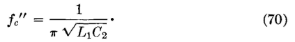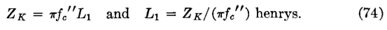 for both the T and the π sections. They further show that the impedance values then diverge and that at the value f = fc" (that is, at the cutoff frequency) ZKT = 0 and Z Kπ = ∞. It is common practice to design a low-pass filter so that the iterative impedance ZK computed at f = 0 and given by equation 73 equals the impedance of the line in which it is to operate. It is now possible to derive the design equations for low-pass filters. The upper cutoff frequency was found from the relation -ωc2L1C2 = -4. If 2πfc" is substituted for ωc, this relation can be arranged L1/C2 = (2πfc"L1)2/4. But ZK = sqrt(L1/C2), and thus