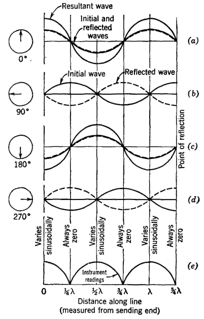 The impressed voltage will, of course, force a current into the line. The initial current component of the electromagnetic wave will travel down the line as indicated in Fig. 7(a) Because the line is open circuited, the current at the distant end must be zero. For this to be possible it is necessary that a 180° phase shift of the magnetic field and current component of the electromagnetic wave occur at the open-circuited end of the line. Then, the reflected component will cancel the oncoming initial component, and the resultant magnetic field and the current will be zero. If the relations between the initial and the reflected components are studied for other input phase positions, Figs. 7(b), (c), and (d) result. If thermomilliammeters are inserted at various points along the line, the effective value of the current readings will plot as shown in Fig. 7(e). This curve is called a current standing wave.