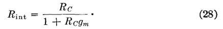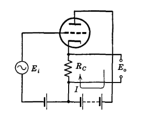 The input capacitance of the following tube plus the wiring capacitance are important factors limiting the high-frequency response (page 289). For this reason, a circuit called the cathode follower28 is often used between two wideband amplifying stages. The circuit arrangement is shown in Fig. 33. The cathode follower has a grid-input capacitance that is much less than the actual capacitance between grid and cathode. The grid-input impedance is correspondingly high. The internal impedance as measured at the output terminals is a low resistance