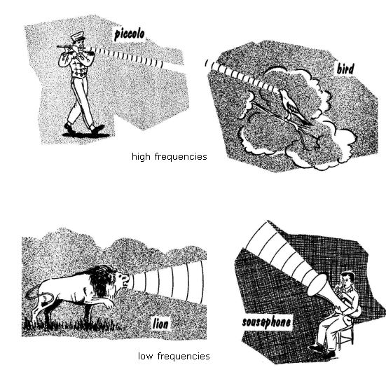 From this we can see a pattern emerging: low frequencies need a big thing to radiate them successfully, but high frequencies can come from quite small objects or sources. Which explains why small birds chirp at higher frequencies, and only larger animals, like lions, can produce a deep-throated roar.