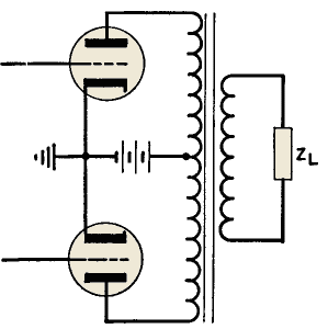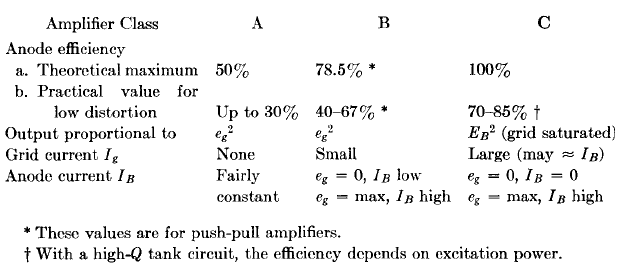 Class A amplifiers are characterized by comparatively high no-signal anode current. Usually the grid never swings positive. Anode current remains comparatively constant, when averaged over a whole a-c cycle. In class B amplifiers, the grid is biased at a greater negative potential so that current is nearly cut off in the absence of a signal. Positive swings of grid voltage result in anode current being drawn; this causes a dip in the residual voltage on the plate of the amplifier. Negative grid swings cause no plate current to flow but do cause a positive plate voltage swing. In class C amplifiers, the grid is biased more negatively still, with the result that plate current flows for less than half a cycle, and mostly when the plate voltage on the tube is at a relatively low value. Grid current in this class of amplifier reaches values comparable to the plate current. Output voltage wave form is maintained by a tuned plate circuit. Operation may sometimes be improved by the use of two tubes connected push-pull, as shown in Fig. 106.