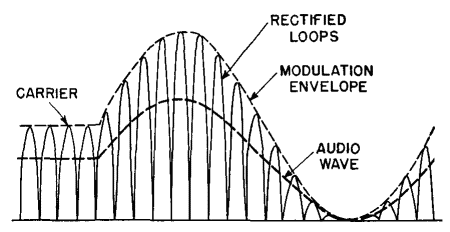 Each half of the r-f cycle is rectified and the d-c power is absorbed in resistor R3. Audio power is bypassed around R3 by capacitor C2, and the voltage is impressed upon the primary of transformer T2. If an amplitude-modulated wave is used in this amplifier, the output voltage of winding S1 on transformer T1 has the form shown in Fig. 200. The first few cycles are shown as full-wave rectified loops with constant amplitude, that is, with no modulation. The audio output for this section of the wave is zero. A sine-wave envelope of 100 per cent modulation is shown in the rest of the figure. Average voltage left after the carrier frequency half-loops have been absorbed by the r-f filter L1C1 is the audio voltage impressed on transformer T2. The method of demodulation just described is known as diode demodulation. It is often accomplished by means of a single diode, and then every other lobe of the wave in Fig. 200 is omitted. Methods are in use also for demodulation with a triode, in which some amplification of the demodulated wave is obtained.