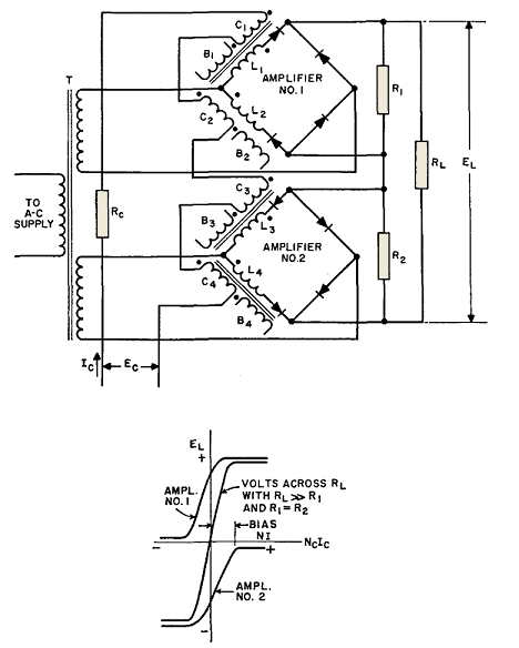 Bias windings on each reactor carry current in such directions that amplifier outputs cancel for Ec = 0. For positive Ec, amplifier 1 produces positive EL, and for negative Ec, amplifier 2 produces negative EL. This circuit has low efficiency, owing to the power dissipated in the balance resistances R1 and R2 but has linear output. It is important, wherever two or more reactors are used together in magnetic amplifiers, that the reactors be alike in turns and in cores. Cores are generally selected to "match," with closely duplicated B-H characteristics. It is not feasible to compensate core differences in balanced amplifiers by bias adjustments and still obtain linear output.