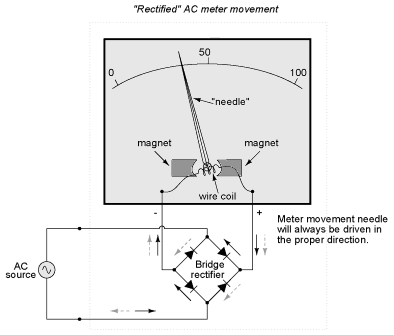 In order to use a DC-style meter movement such as the D'Arsonval design, the alternating current must be rectified into DC. This is most easily accomplished through the use of devices called diodes. We saw diodes used in an example circuit demonstrating the creation of harmonic frequencies from a distorted (or rectified) sine wave. Without going into elaborate detail over how and why diodes work as they do, just remember that they each act like a one-way valve for electrons to flow: acting as a conductor for one polarity and an insulator for another. Oddly enough, the arrowhead in each diode symbol points against the permitted direction of electron flow rather than with it as one might expect. Arranged in a bridge, four diodes will serve to steer AC through the meter movement in a constant direction throughout all portions of the AC cycle: