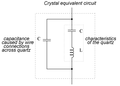 Electrically, that quartz chip is equivalent to a series LC resonant circuit. The dielectric properties of quartz contribute an additional capacitive element to the equivalent circuit, and in the end it looks something like this: