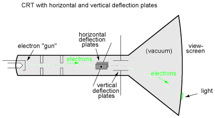 The "capacitance" and "inductance" shown in series are merely electrical equivalents of the quartz's mechanical resonance properties: they do not exist as discrete components within the crystal. The capacitance shown in parallel due to the wire connections across the dielectric (insulating) quartz body is real, and it has an effect on the resonant response of the whole system. A full discussion on crystal dynamics is not necessary here, but what needs to be understood about crystals is this resonant circuit equivalence and how it can be exploited within an oscillator circuit to achieve an output voltage with a stable, known frequency. quality factorCrystals, as resonant elements, typically have much higher "Q" (quality) values than tank circuits built from inductors and capacitors, principally due to the relative absence of stray resistance, making their resonant frequencies very definite and precise. Because the resonant frequency is solely dependent on the physical properties of quartz (a very stable substance, mechanically), the resonant frequency variation over time with a quartz crystal is very, very low. This is how quartz movement watches obtain their high accuracy: by means of an electronic oscillator stabilized by the resonant action of a quartz crystal. For laboratory applications, though, even greater frequency stability may be desired. To achieve this, the crystal in question may be placed in a temperature stabilized environment (usually an oven), thus eliminating frequency errors due to thermal expansion and contraction of the quartz. atomic clockFor the ultimate in a frequency standard though, nothing discovered thus far surpasses the accuracy of a single resonating atom. This is the principle of the so-called atomic clock, which uses an atom of mercury (or cesium) suspended in a vacuum, excited by outside energy to resonate at its own unique frequency. The resulting frequency is detected as a radio-wave signal and that forms the basis for the most accurate clocks known to humanity. National standards laboratories around the world maintain a few of these hyper-accurate clocks, and broadcast frequency signals based on those atoms' vibrations for scientists and technicians to tune in and use for frequency calibration purposes. Now we get to the practical part: once we have a source of accurate frequency, how do we compare that against an unknown frequency to obtain a measurement? One way is to use a CRT as a frequency-comparison device. Cathode Ray Tubes typically have means of deflecting the electron beam in the horizontal as well as the vertical axis. If metal plates are used to electrostatically deflect the electrons, there will be a pair of plates to the left and right of the beam as well as a pair of plates above and below the beam.
