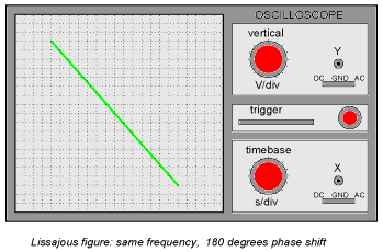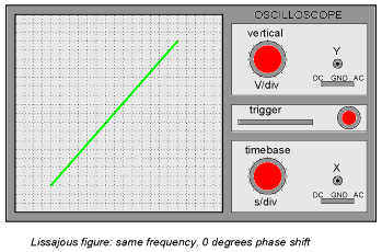 If we allow one AC signal to deflect the beam up and down (connect that AC voltage source to the "vertical" deflection plates) and another AC signal to deflect the beam left and right (using the other pair of deflection plates), patterns will be produced on the screen of the CRT indicative of the ratio of these two AC frequencies. These patterns are called Lissajous figures and are a common means of comparative frequency measurement in electronics. oscilloscopeIf the two frequencies are the same, we will obtain a simple figure on the screen of the CRT, the shape of that figure being dependent upon the phase shift between the two AC signals. Here is a sampling of Lissajous figures for two sine-wave signals of equal frequency, shown as they would appear on the face of an oscilloscope (an AC voltage-measuring instrument using a CRT as its "movement"). The first picture is of the Lissajous figure formed by two AC voltages perfectly in phase with each other:
