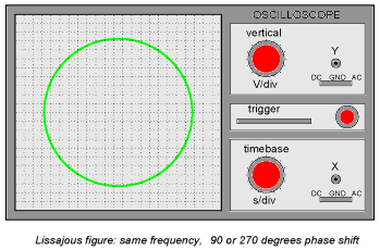 If the two AC voltages are not in phase with each other, a straight line will not be formed. Rather, the Lissajous figure will take on the appearance of an oval, becoming perfectly circular if the phase shift is exactly 90o between the two signals, and if their amplitudes are equal: