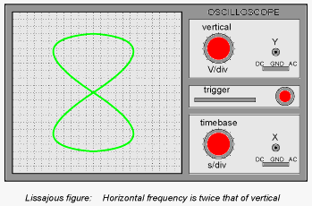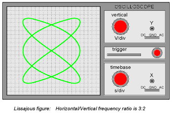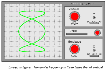 The more complex the ratio between horizontal and vertical frequencies, the more complex the Lissajous figure. Consider the following illustration of a 3:1 frequency ratio between horizontal and vertical: