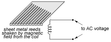Frequency and Phase MeasurementFrequencyAn important electrical quantity with no equivalent in DC circuits is frequency. Frequency measurement is very important in many applications of alternating current, especially in AC power systems designed to run efficiently at one frequency and one frequency only. If the AC is being generated by an electromechanical alternator, the frequency will be directly proportional to the shaft speed of the machine, and frequency could be measured simply by measuring the speed of the shaft. If frequency needs to be measured at some distance from the alternator, though, other means of measurement will be necessary. resonance, mechanicalOne simple but crude method of frequency measurement in power systems utilizes the principle of mechanical resonance. Every physical object possessing the property of elasticity (springiness) has an inherent frequency at which it will prefer to vibrate. The tuning fork is a great example of this: strike it once and it will continue to vibrate at a tone specific to its length. Longer tuning forks have lower resonant frequencies: their tones will be lower on the musical scale than shorter forks. frequency meter reed frequency meterImagine a row of progressively-sized tuning forks arranged side-by-side. They are all mounted on a common base, and that base is vibrated at the frequency of the measured AC voltage (or current) by means of an electromagnet. Whichever tuning fork is closest in resonant frequency to the frequency of that vibration will tend to shake the most (or the loudest). If the forks' tines were flimsy enough, we could see the relative motion of each by the length of the blur we would see as we inspected each one from an end-view perspective. Well, make a collection of "tuning forks" out of a strip of sheet metal cut in a pattern akin to a rake, and you have the vibrating reed frequency meter: