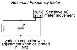 Vibrating reed meters, obviously, are not precision instruments, but they are very simple and therefore easy to manufacture to be rugged. They are often found on small engine-driven generator sets for the purpose of setting engine speed so that the frequency is somewhat close to 60 (50 in Europe) Hertz. resonant frequency meterWhile reed-type meters are imprecise, their operational principle is not. In lieu of mechanical resonance, we may substitute electrical resonance and design a frequency meter using an inductor and capacitor in the form of a tank circuit (parallel inductor and capacitor). One or both components are made adjustable, and a meter is placed in the circuit to indicate maximum amplitude of voltage across the two components. The adjustment knob(s) are calibrated to show resonant frequency for any given setting, and the frequency is read from them after the device has been adjusted for maximum indication on the meter. Essentially, this is a tunable filter circuit which is adjusted and then read in a manner similar to a bridge circuit (which must be balanced for a "null" condition and then read).