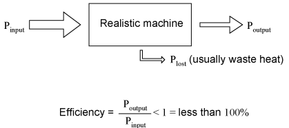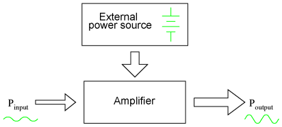 Because of this disparity between controlling and controlled powers, active devices may be employed to govern a large amount of power (controlled) by the application of a small amount of power (controlling). This behavior is known as amplification. It is a fundamental rule of physics that energy can neither be created nor destroyed. Stated formally, this rule is known as the Law of Conservation of Energy, and no exceptions to it have been discovered to date. If this Law is true -- and an overwhelming mass of experimental data suggests that it is -- then it is impossible to build a device capable of taking a small amount of energy and magically transforming it into a large amount of energy. All machines, electric and electronic circuits included, have an upper efficiency limit of 100 percent. At best, power out equals power in as in Figure below. The power output of a machine can approach, but never exceed, the power input for 100% efficiency as an upper limit. Usually, machines fail even to meet this limit, losing some of their input energy in the form of heat which is radiated into surrounding space and therefore not part of the output energy stream. (Figure below) A realistic machine most often looses some of its input energy as heat in transforming it into the output energy stream. Many people have attempted, without success, to design and build machines that output more power than they take in. Not only would such a perpetual motion machine prove that the Law of Energy Conservation was not a Law after all, but it would usher in a technological revolution such as the world has never seen, for it could power itself in a circular loop and generate excess power for “free”. (Figure below) Hypothetical “perpetual motion machine” powers itself? Despite much effort and many unscrupulous claims of “free energy” or over-unity machines, not one has ever passed the simple test of powering itself with its own energy output and generating energy to spare. There does exist, however, a class of machines known as amplifiers, which are able to take in small-power signals and output signals of much greater power. The key to understanding how amplifiers can exist without violating the Law of Energy Conservation lies in the behavior of active devices. Because active devices have the ability to control a large amount of electrical power with a small amount of electrical power, they may be arranged in circuit so as to duplicate the form of the input signal power from a larger amount of power supplied by an external power source. The result is a device that appears to magically magnify the power of a small electrical signal (usually an AC voltage waveform) into an identically-shaped waveform of larger magnitude. The Law of Energy Conservation is not violated because the additional power is supplied by an external source, usually a DC battery or equivalent. The amplifier neither creates nor destroys energy, but merely reshapes it into the waveform desired as shown in Figure below. While an amplifier can scale a small input signal to large output, its energy source is an external power supply. In other words, the current-controlling behavior of active devices is employed to shape DC power from the external power source into the same waveform as the input signal, producing an output signal of like shape but different (greater) power magnitude. The transistor or other active device within an amplifier merely forms a larger copy of the input signal waveform out of the “raw” DC power provided by a battery or other power source. Amplifiers, like all machines, are limited in efficiency to a maximum of 100 percent. Usually, electronic amplifiers are far less efficient than that, dissipating considerable amounts of energy in the form of waste heat. Because the efficiency of an amplifier is always 100 percent or less, one can never be made to function as a “perpetual motion” device. The requirement of an external source of power is common to all types of amplifiers, electrical and non-electrical. A common example of a non-electrical amplification system would be power steering in an automobile, amplifying the power of the driver's arms in turning the steering wheel to move the front wheels of the car. The source of power necessary for the amplification comes from the engine. The active device controlling the driver's “input signal” is a hydraulic valve shuttling fluid power from a pump attached to the engine to a hydraulic piston assisting wheel motion. If the engine stops running, the amplification system fails to amplify the driver's arm power and the car becomes very difficult to turn.