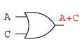 The final expression, B(A + C), is much simpler than the original, yet performs the same function. If you would like to verify this, you may generate a truth table for both expressions and determine Q's status (the circuits' output) for all eight logic-state combinations of A, B, and C, for both circuits. The two truth tables should be identical. Now, we must generate a schematic diagram from this Boolean expression. To do this, evaluate the expression, following proper mathematical order of operations (multiplication before addition, operations inside parentheses before anything else), and draw gates for each step. Remember again that OR gates are equivalent to Boolean addition, while AND gates are equivalent to Boolean multiplication. In this case, we would begin with the sub-expression "A + C", which is an OR gate: