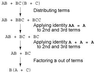 Now that we have a Boolean expression to work with, we need to apply the rules of Boolean algebra to reduce the expression to its simplest form (simplest defined as requiring the fewest relay contacts to implement):