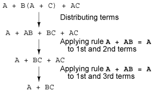 The more mathematically inclined should be able to see that the two steps employing the rule "A + AB = A" may be combined into a single step, the rule being expandable to: "A + AB + AC + AD + . . . = A"