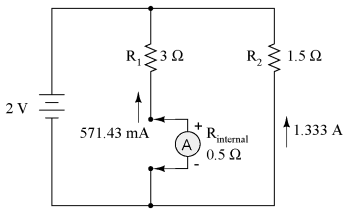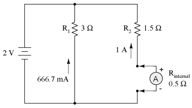 With the ammeter disconnected from this circuit, the current through the 3 Ω resistor would be 666.7 mA, and the current through the 1.5 Ω resistor would be 1.33 amps. If the ammeter had an internal resistance of 1/2 Ω, and it were inserted into one of the branches of this circuit, though, its resistance would seriously affect the measured branch current: