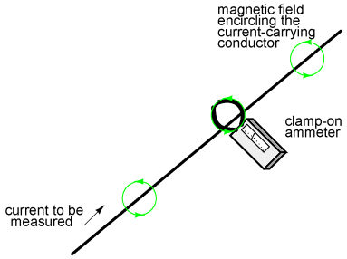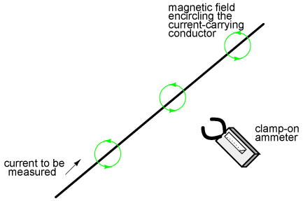 One ingenious way to reduce the impact that a current-measuring device has on a circuit is to use the circuit wire as part of the ammeter movement itself. All current-carrying wires produce a magnetic field, the strength of which is in direct proportion to the strength of the current. By building an instrument that measures the strength of that magnetic field, a no-contact ammeter can be produced. Such a meter is able to measure the current through a conductor without even having to make physical contact with the circuit, much less break continuity or insert additional resistance.