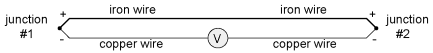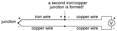 The second iron/copper junction formed by the connection between the thermocouple and the meter on the top wire will produce a temperature-dependent voltage opposed in polarity to the voltage produced at the measurement junction. This means that the voltage between the voltmeter's copper leads will be a function of the difference in temperature between the two junctions, and not the temperature at the measurement junction alone. Even for thermocouple types where copper is not one of the dissimilar metals, the combination of the two metals joining the copper leads of the measuring instrument forms a junction equivalent to the measurement junction: