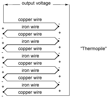 However, in most applications the intent is to measure temperature at a single point only, and in these cases the second junction becomes a liability to function. Reference junction compensation Compensation, thermocouple reference junctionCompensation for the voltage generated by the reference junction is typically performed by a special circuit designed to measure temperature there and produce a corresponding voltage to counter the reference junction's effects. At this point you may wonder, "If we have to resort to some other form of temperature measurement just to overcome an idiosyncrasy with thermocouples, then why bother using thermocouples to measure temperature at all? Why not just use this other form of temperature measurement, whatever it may be, to do the job?" The answer is this: because the other forms of temperature measurement used for reference junction compensation are not as robust or versatile as a thermocouple junction, but do the job of measuring room temperature at the reference junction site quite well. For example, the thermocouple measurement junction may be inserted into the 1800 degree (F) flue of a foundry holding furnace, while the reference junction sits a hundred feet away in a metal cabinet at ambient temperature, having its temperature measured by a device that could never survive the heat or corrosive atmosphere of the furnace. The voltage produced by thermocouple junctions is strictly dependent upon temperature. Any current in a thermocouple circuit is a function of circuit resistance in opposition to this voltage (I=E/R). In other words, the relationship between temperature and Seebeck voltage is fixed, while the relationship between temperature and current is variable, depending on the total resistance of the circuit. With heavy enough thermocouple conductors, currents upwards of hundreds of amps can be generated from a single pair of thermocouple junctions! (I've actually seen this in a laboratory experiment, using heavy bars of copper and copper/nickel alloy to form the junctions and the circuit conductors.) For measurement purposes, the voltmeter used in a thermocouple circuit is designed to have a very high resistance so as to avoid any error-inducing voltage drops along the thermocouple wire. The problem of voltage drop along the conductor length is even more severe here than with the DC voltage signals discussed earlier, because here we only have a few millivolts of voltage produced by the junction. We simply cannot spare to have even a single millivolt of drop along the conductor lengths without incurring serious temperature measurement errors. SpeedomaxIdeally, then, current in a thermocouple circuit is zero. Early thermocouple indicating instruments made use of null-balance potentiometric voltage measurement circuitry to measure the junction voltage. The early Leeds & Northrup "Speedomax" line of temperature indicator/recorders were a good example of this technology. More modern instruments use semiconductor amplifier circuits to allow the thermocouple's voltage signal to drive an indication device with little or no current drawn in the circuit. ThermopileThermocouples, however, can be built from heavy-gauge wire for low resistance, and connected in such a way so as to generate very high currents for purposes other than temperature measurement. One such purpose is electric power generation. By connecting many thermocouples in series, alternating hot/cold temperatures with each junction, a device called a thermopile can be constructed to produce substantial amounts of voltage and current: