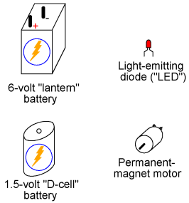 INSTRUCTIONS In all the experiments in this book, you will be using some sort of test equipment to measure aspects of electricity you cannot directly see, feel, hear, taste, or smell. Electricity -- at least in small, safe quantities -- is insensible by our human bodies. Your most fundamental "eyes" in the world of electricity and electronics will be a device called a multimeter. Multimeters indicate the presence of, and measure the quantity of, electrical properties such as voltage, current, and resistance. In this experiment, you will familiarize yourself with the measurement of voltage. Voltage is the measure of electrical "push" ready to motivate electrons to move through a conductor. In scientific terms, it is the specific energy per unit charge, mathematically defined as joules per coulomb. It is analogous to pressure in a fluid system: the force that moves fluid through a pipe, and is measured in the unit of the Volt (V). Your multimeter should come with some basic instructions. Read them well! If your multimeter is digital, it will require a small battery to operate. If it is analog, it does not need a battery to measure voltage. Some digital multimeters are autoranging. An autoranging meter has only a few selector switch (dial) positions. Manual-ranging meters have several different selector positions for each basic quantity: several for voltage, several for current, and several for resistance. Autoranging is usually found on only the more expensive digital meters, and is to manual ranging as an automatic transmission is to a manual transmission in a car. An autoranging meter "shifts gears" automatically to find the best measurement range to display the particular quantity being measured. Set your multimeter's selector switch to the highest-value "DC volt" position available. Autoranging multimeters may only have a single position for DC voltage, in which case you need to set the switch to that one position. Touch the red test probe to the positive (+) side of a battery, and the black test probe to the negative (-) side of the same battery. The meter should now provide you with some sort of indication. Reverse the test probe connections to the battery if the meter's indication is negative (on an analog meter, a negative value is indicated by the pointer deflecting left instead of right). If your meter is a manual-range type, and the selector switch has been set to a high-range position, the indication will be small. Move the selector switch to the next lower DC voltage range setting and reconnect to the battery. The indication should be stronger now, as indicated by a greater deflection of the analog meter pointer (needle), or more active digits on the digital meter display. For the best results, move the selector switch to the lowest-range setting that does not "over-range" the meter. An over-ranged analog meter is said to be "pegged," as the needle will be forced all the way to the right-hand side of the scale, past the full-range scale value. An over-ranged digital meter sometimes displays the letters "OL", or a series of dashed lines. This indication is manufacturer-specific. What happens if you only touch one meter test probe to one end of a battery? How does the meter have to connect to the battery in order to provide an indication? What does this tell us about voltmeter use and the nature of voltage? Is there such a thing as voltage "at" a single point? Be sure to measure more than one size of battery, and learn how to select the best voltage range on the multimeter to give you maximum indication without over-ranging. Now switch your multimeter to the lowest DC voltage range available, and touch the meter's test probes to the terminals (wire leads) of the light-emitting diode (LED). An LED is designed to produce light when powered by a small amount of electricity, but LEDs also happen to generate DC voltage when exposed to light, somewhat like a solar cell. Point the LED toward a bright source of light with your multimeter connected to it, and note the meter's indication: