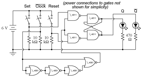 INSTRUCTIONS The only difference between a gated (or enabled) latch and a flip-flop is that a flip-flop is enabled only on the rising or falling edge of a "clock" signal, rather than for the entire duration of a "high" enable signal. Converting an enabled latch into a flip-flop simply requires that a "pulse detector" circuit be added to the Enable input, so that the edge of a clock pulse generates a brief "high" Enable pulse: The single NOR gate and three inverter gates create this effect by exploiting the propagation delay time of multiple, cascaded gates. In this experiment, I use three NOR gates with paralleled inputs to create three inverters, thus using all four NOR gates of a 4001 integrated circuit: Normally, when using a NOR gate as an inverter, one input would be grounded while the other acts as the inverter input, to minimize input capacitance and increase speed. Here, however, slow response is desired, and so I parallel the NOR inputs to make inverters rather than use the more conventional method. Please note that this particular pulse detector circuit produces a "high" output pulse at every falling edge of the clock (input) signal. This means that the flip-flop circuit should be responsive to the Set and Reset input states only when the middle switch is moved from "on" to "off," not from "off" to "on." Bounce, switch contact Contact bounceWhen you build this circuit, though, you may discover that the outputs respond to Set and Reset input signals during both transitions of the Clock input, not just when it is switched from a "high" state to a "low" state. The reason for this is contact bounce: the effect of a mechanical switch rapidly making-and-breaking when its contacts are first closed, due to the elastic collision of the metal contact pads. Instead of the Clock switch producing a single, clean low-to-high signal transition when closed, there will most likely be several low-high-low "cycles" as the contact pads "bounce" upon off-to-on actuation. The first high-to-low transition caused by bouncing will trigger the pulse detector circuit, enabling the S-R latch for that moment in time, making it responsive to the Set and Reset inputs. Ideally, of course, switches are perfect and bounce-free. In the real world, though, contact bounce is a very common problem for digital gate circuits operated by switch inputs, and must be understood well if it is to be overcome.