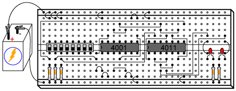 Caution! The 4011 IC is CMOS, and therefore sensitive to static electricity! Although the parts list calls for a ten-segment LED unit, the illustration shows two individual LEDs being used instead. This is due to lack of room on my breadboard to mount the switch assembly, two integrated circuits, and the bargraph. If you have room on your breadboard, feel free to use the bargraph as called for in the parts list, and as shown in prior latch circuits.