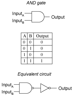 The truth table and equivalent gate circuit (an inverted-output NAND gate) are shown here: