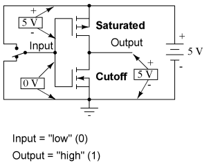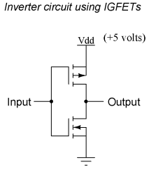 CMOS gate circuitryUp until this point, our analysis of transistor logic circuits has been limited to the TTL design paradigm, whereby bipolar transistors are used, and the general strategy of floating inputs being equivalent to "high" (connected to Vcc) inputs -- and correspondingly, the allowance of "open-collector" output stages -- is maintained. This, however, is not the only way we can build logic gates. NOT gate, CMOS Inverter gate, CMOSField-effect transistors, particularly the insulated-gate variety, may be used in the design of gate circuits. Being voltage-controlled rather than current-controlled devices, IGFETs tend to allow very simple circuit designs. Take for instance, the following inverter circuit built using P- and N-channel IGFETs: