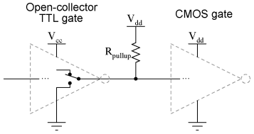 Also, this problem arises if a CMOS gate input is being driven by an open-collector TTL gate. Because such a TTL gate's output floats when it goes "high" (1), the CMOS gate input will be left in an uncertain state: