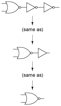 In essence, the B-series design enhancement adds two inverters to the output of a simple NOR circuit. This serves no purpose as far as digital logic is concerned, since two cascaded inverters simply cancel: