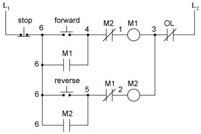 Motor control circuitsThe interlock contacts installed in the previous section's motor control circuit work fine, but the motor will run only as long as each pushbutton switch is held down. If we wanted to keep the motor running even after the operator takes his or her hand off the control switch(es), we could change the circuit in a couple of different ways: we could replace the pushbutton switches with toggle switches, or we could add some more relay logic to "latch" the control circuit with a single, momentary actuation of either switch. Let's see how the second approach is implemented, since it is commonly used in industry:
