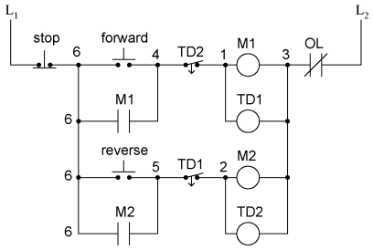 If the motor has been running in the forward direction, both M1 and TD1 will have been energized. This being the case, the normally-closed, timed-closed contact of TD1 between wires 8 and 5 will have immediately opened the moment TD1 was energized. When the stop button is pressed, contact TD1 waits for the specified amount of time before returning to its normally-closed state, thus holding the reverse pushbutton circuit open for the duration so M2 can't be energized. When TD1 times out, the contact will close and the circuit will allow M2 to be energized, if the reverse pushbutton is pressed. In like manner, TD2 will prevent the "Forward" pushbutton from energizing M1 until the prescribed time delay after M2 (and TD2) have been de-energized. The careful observer will notice that the time-interlocking functions of TD1 and TD2 render the M1 and M2 interlocking contacts redundant. We can get rid of auxiliary contacts M1 and M2 for interlocks and just use TD1 and TD2's contacts, since they immediately open when their respective relay coils are energized, thus "locking out" one contactor if the other is energized. Each time delay relay will serve a dual purpose: preventing the other contactor from energizing while the motor is running, and preventing the same contactor from energizing until a prescribed time after motor shutdown. The resulting circuit has the advantage of being simpler than the previous example: